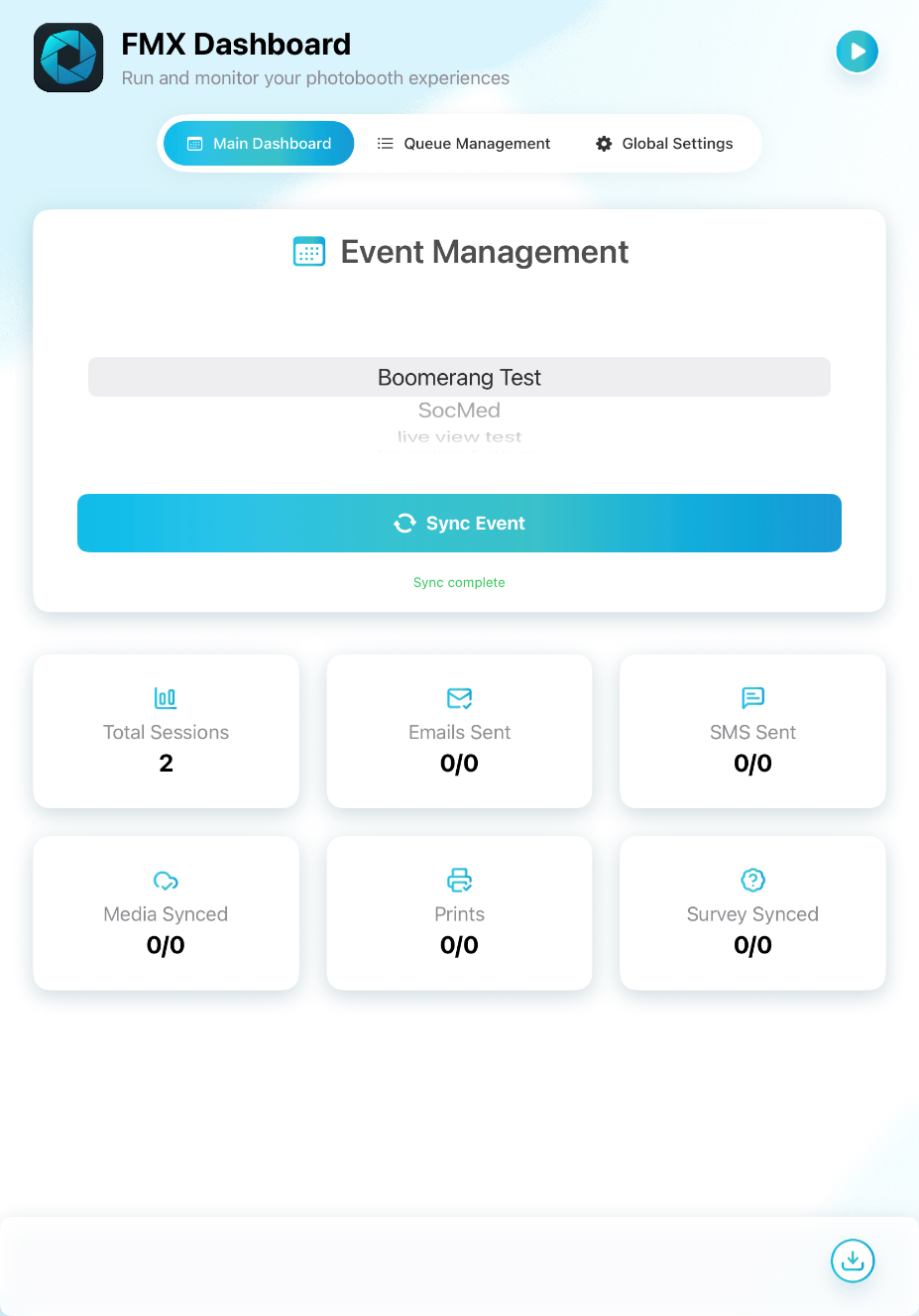 - Monitor live stats (sessions, surveys, emails, SMS, media sync, prints)