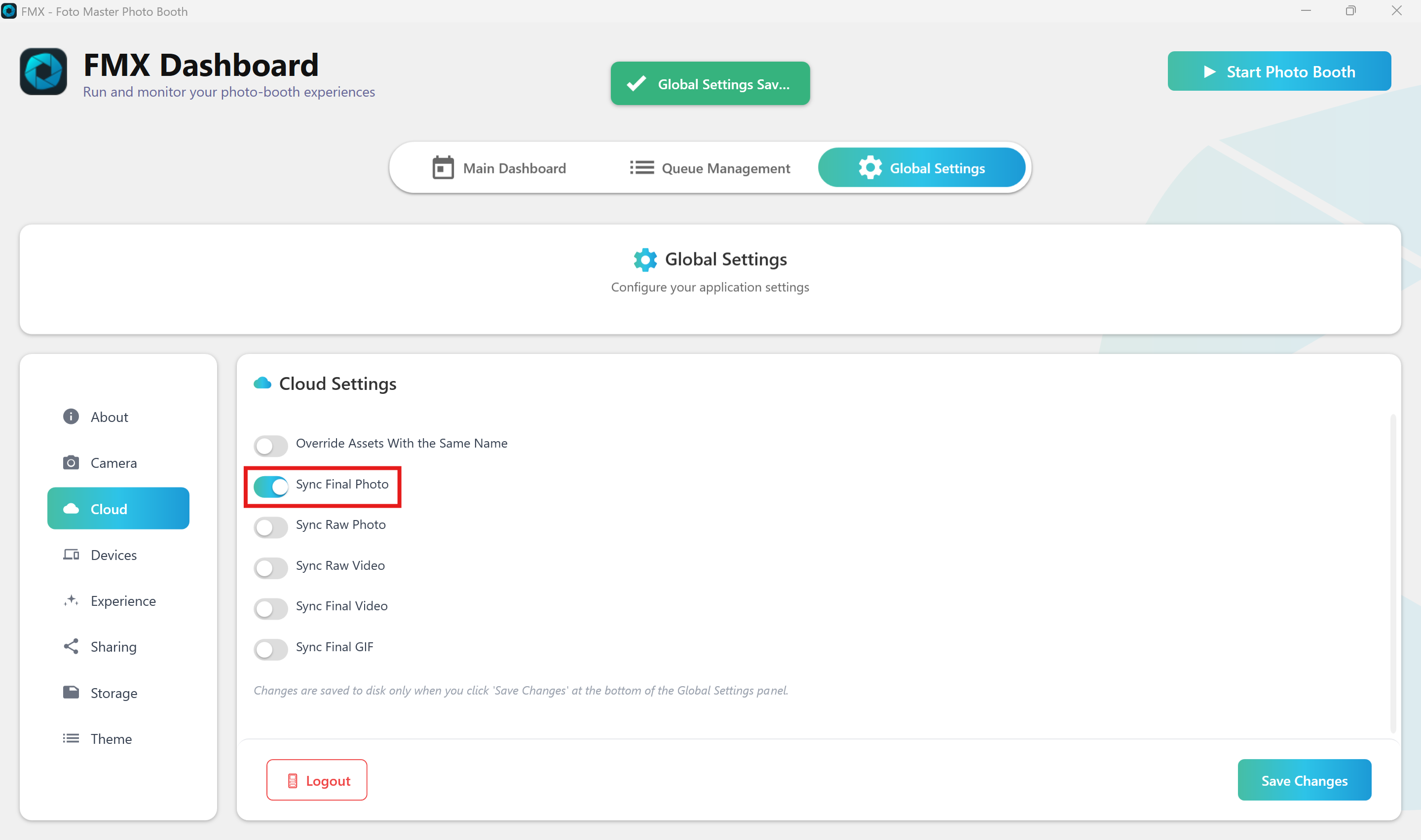 This configuration is ideal when you do not require a backup of raw files or videos on your cloud account and want to prioritize print delivery. Syncing raw files and extra media creates a bottleneck; for optimal performance, disable all sync options except for the final output: